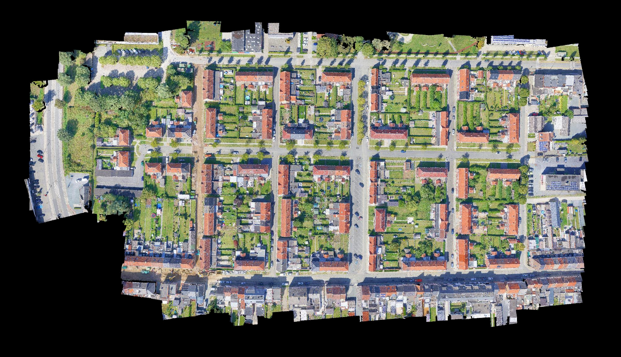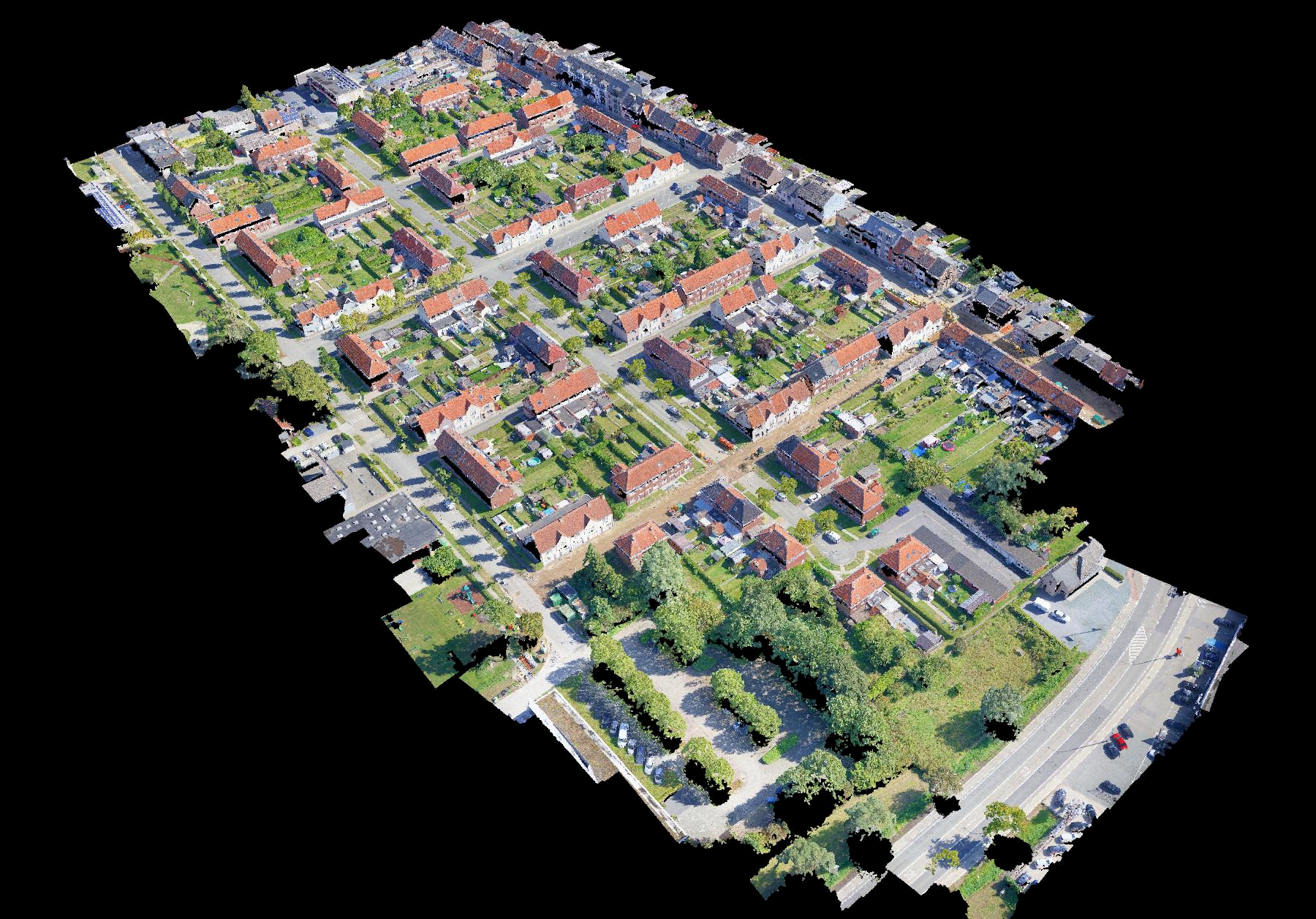 Landmeters Cuyt heeft voor dit project de aannemer bijgestaan voor de opmetingen, uitzetwerken en dronevluchten. Voor aanvang van de werf hebben we door middel van een dronevlucht alle niveaus van de daken van de wijk in kaart gebracht.